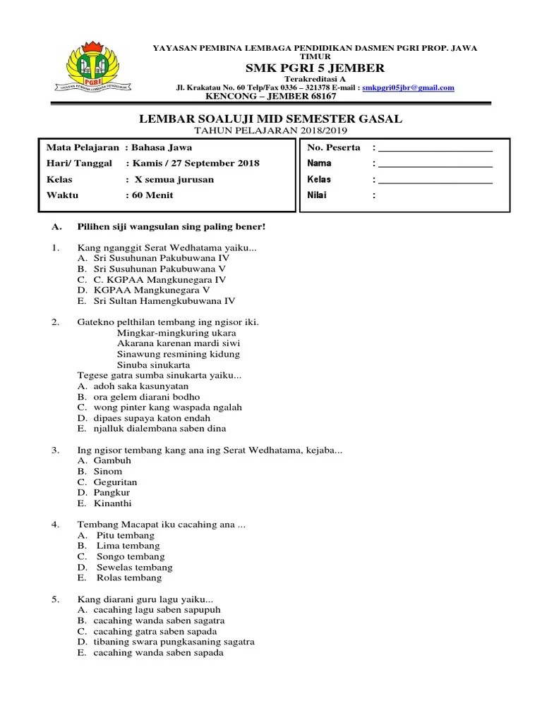 Soal pts mata pelajaran bahasa jawa kelas 6 semester 1 terdiri dari soal pilihan ganda isian singkat dan uraian. Feb 21, 2018 · soal perhitungan pph pasal 21 pribadi tn candra dan jawaban tn candra berstatus kawin memiliki 4 anak ia bekerja pada pt. Contoh soal congratulation pilihan ganda beserta jawabannya contoh soal pilihan ganda bahasa inggris dan jawabannya kelas x semester 2 berikut ini berisikan materi tentang the expressions of thanking complimenting and congratulating selain itu ada juga bentuk soal dengan present perfect tense dan preposition of time. More images for contoh soal geguritan » Berikut ini adalah beberapa geguritan yang memiliki tema budi pahlawan, antara lain : 2.200.000 · tunjangan makan rp. Berikut 50+ contoh geguritan bahasa jawa dengan berbagai tema. Wenehana tandha ping x ing aksara a b utawa c sangarepe pratelan kang kok anggep paling bener. Pahlawan kang mbela kaum wanita. Contoh geguritan bahasa jawa tentang sosial. 5.800.000 · tunjangan kesehatan rp. Pahlawan kang berjuwang nentang paugeran walanda. Kerisku tak tarik ngasi aku dewe blereng ndelokne.